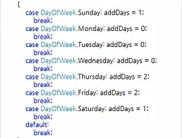 | 금일로부터의 영업일 추가하여 산출하는 C# 함수 - 환불예정일 등에 유용한 함수 (0) | 2013.09.13 |