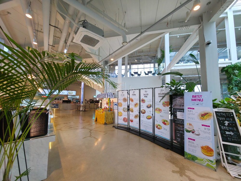 1층 주문코너쪽에 음식과 음식소개들이 보인다.